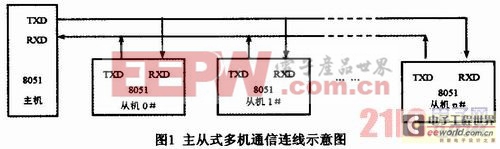 计算机之间的通信除了点对点通信外,还有一机对多机或多机之间的通信,构成计算机网络,其中主从式多机通信是比较常用的一种方式。在主从式多机通信系统中,只有一台主机,但可以有多台从机。主机发送的信息可以传送到各个从机或指定从机,从机发送的信息只能为主机所接收,各从机之间不能直接通信。主机通常由PC机担任,也可用单片机担当(本文研究的是用单片机作主机),从机通常为单片机。 MCS-51单片机串行口的方式2和方式3具有多机通信功能,可实现一台主机和若干台从机构成总线式的多机分布式系统,其连接方式如图1所示。