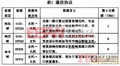 多机通信是一个复杂的通信过程,必须有通信协议来保证多机通信的可操作性和操作秩序,实现收/发双方的响应与协调。这些通信协议,至少应包括从机的地址、主机的控制命令、从机的响应帧格式和数据通信格式等的约定,本文建立交通灯控制网络系统的通信协议如表1