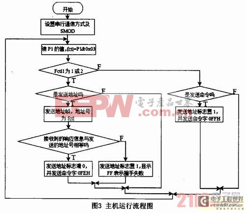 主机主要负责呼叫从机,发送控制命令以及从机响应帧的接收,数据的显示等功能。为了保证主、从机之间握手的成功,主机采用查询方式发送和接收数据,串行口的工作方式设置为方式2,SMOD=0。其流程图如图3所示。