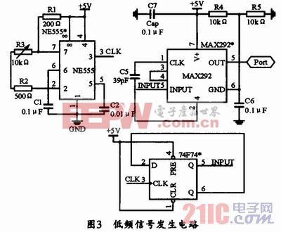 低频信号发生模块电路可采用NE555构成多谐振荡器,当该振荡器输出波形信号后,再接以7474锁存器为主要部件组成二分频电路,最后再用MAX298组成低通滤波器以进行滤波,就能得到所需的低频信号波。MAXIM公司生产的MAX29X系列8阶低通开关电容滤波器由于使用方便、设计简单、尺寸小(有8-pin DIP封装),因而在ADC的反混叠滤波、噪声分析、电源噪声抑制等领域得到了广泛的应用。这里不采用MAX03 8来产生低频波的原因主要是两种波形参杂的直流电平不同时,其混频以后效果不明显。而用MAX298进行滤波,则可以在5 kHz~10 kHz频率内得到很好的滤波效果,具体的低频信号发生电路如图3所示。其中振荡周期由NE555中R1,R2和C1确定,具体公式为: