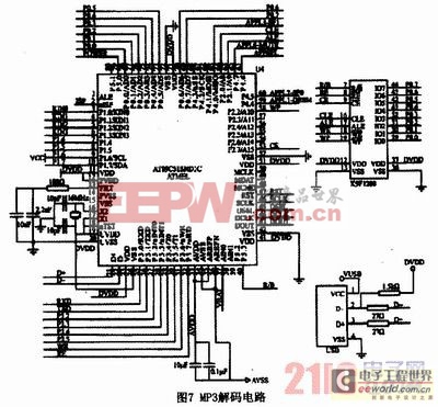 本文采用MP3解码模块进行音乐播放与控制。可读取USB、SD、MMC卡中的MP3文件,支持FAT12、FAT16的文件系统。支持MP1layer3、MP2layer3、MP3layer3版本歌曲文件。其原理如图7所示。