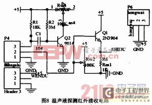 婴儿车的探测系统在本产品中起着至关重要的地位,主要探测的物理量有奶瓶的温度、婴儿的哭声和婴儿身下的液体。奶瓶的温度采用18B20进行测量。针对婴儿哭声的分贝数高而持续时间长的特点,采用灵敏度较低的声音触发电路触发高低电平给中央处理器,同时这种设计也可以检测外部分贝高且持续时间长的噪声。红外电路主要的是红外接收管。其电路如图8所示。