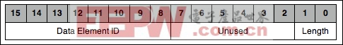在这种设计中,存储阵列中的数据条目并不是以地址作参考,而是以数据元编号为参考。数据元编号是一个和数据元素一一对应的任意8位数值。所以在这个方案中最大可以有255个数据元(数据元0预留)。每个数据元包含:包括数据元编号和数据元长度的双字节报头(图1);指示1、2、3或者4个16位字的两位码,以保留足够的剩余空间进行错误管理。