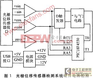 图1是一个光栅位移传感器检测系统硬件电路框图,主要实现数据的采集、处理、传输和PWM脉冲的产生等。从光栅传感器输入的信号有5路:±sin,±cos以及零窗信号zero。经差分放大电路合成,分3路进入PIC单片机模拟量输入口进行A/D转换;同时,经差分放大电路合成后的sin、cos信号经过零比较器后转换成数字脉冲信号,然后经D触发器和“与”门电路完成光栅位移的辨向。PIC单片机T0和T1口接收来自“与”门电路的数字脉冲,完成光栅位移的计数(计算光栅尺移动的完整光栅数);PIC单片机RC1口输出4 MHz的PWM脉冲信号作为D触发器的CP信号。计算机的USB接口两根数据线分别接PIC18F4550的D+和D-口,用于完成计算机和单片机之间的数据通信。计算机的USB电源一方面为PIC微处理器提供能源,另一方面通过电源模块转换成±12 V电源,为运放电路提供正负电源。
