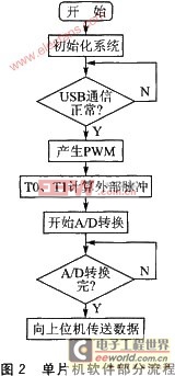 单片机的软件部分主要完成光栅位移传感器的数据采集、A/D转换、计算光栅位移传感器的正向、反向莫尔条纹的个数、为数字电路提供CP脉冲以及完成USB的通信等工作。图2是单片机软件部分的流程图。