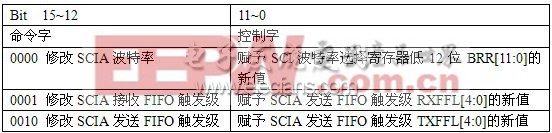 对硬件工作参数的修改是通过中断方式实现的。自定义一个16位控制寄存器User_CSR,其高4位用作命令字,低12位用作控制字。当应用程序通过PCI总线向User_CSR写进数据时,CPLD通过译码逻辑向F2812的外部中断管脚XINT2发出中断信号,F2812响应中断后,读取User_CSR的值,根据其命令字判定需要修改的是哪种参数,再根据其控制字得到新的参数值,将其写进相应的寄存器,即可完成修改。由于篇幅所限,仅以修改SCIA的设置为例,说明具体实现方法。User_CSR对SCIA修改的定义如下: