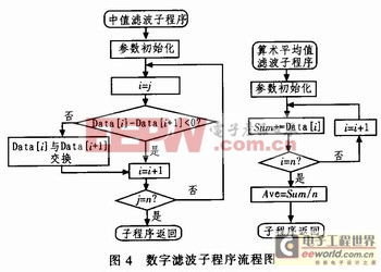 中值滤波算法是对某一被测参数连续采样n次(一般n取奇数)。n次采样值按照大小排列,取中间值作为本次采样值。中值滤波算法能有效克服因偶然因素引起的波动干扰。对于温度、液体表面等变化缓慢的被测参数,能收到良好的滤波效果。中值滤波子程序和算术平均值滤波子程序流程见图4。