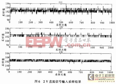 在2 V信号输入的条件下,信号处理单元的采样结果(随机取样1 000次)见图6。图中的(1)(2)(3)分别表示单片机1在没有使用数字滤波算法,采用中值滤波算法和算术平均值滤波算法的条件下得到的输出结果。采样结果中,在理想情况下,采样值应该是102。