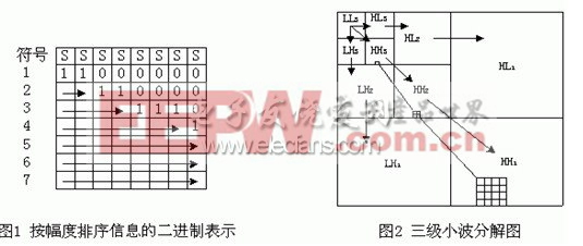 由图1可知内嵌编码的输出信息主要包括两部分:排序信息和重要象素的位信息。其中,位信息是编码必不可少的有效信息,对应于表中箭头所划过的比特位;而排序信息则是辅助信息,按其重要性从左到右排列,反映了重要象素在原图上的空间位置,用于恢复原始的数据结构。因此,内嵌算法中排序算法的优劣和排序信息的处理决定了整个编码算法的效率。