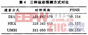 (3)对全像素块运动预测搜索的方式,X.264默认为HEX(正六边形搜索半径为2),在对比测试了DIA(菱形搜索,半径为1)和UMH(可变半径六边形搜索)后,对比了速率和峰值信噪比后,发现在峰值信噪比相差很小的情况下DIA搜索速率最快,本文选择DIA作为运动预测搜索方式。表4给出3种方式的对比结果: