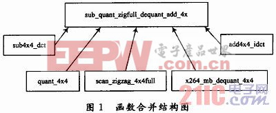 (4)函数合并。函数调用的过程中,要执行一些额外的寄存器。在编码过程中DCT、量化、zigzag、IDCT和反量化函数调用都非常频繁,但代码段都很短,部分代码只包含一个循环操作或者赋值操作。反复的调用会花费大量运行周期在函数调用上。为减少不必要的操作,提高速度,将DCT变换、量化、反量化和反DCT变化的整个过程进行优化,将几个函数合并到一个函数中。图1所示为合并结构。