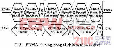 (2)EDMA。EDMA是增强的直接存储器访问,增加了高达64个传输通道,每个通道相互独立,且通道间的优先级可以设置。CIF格式的图像格式为352×288,一帧数据需要101 376 b,L2的CACHE容量有限,不能将所需要的参考帧和当前编码帧都放到片内CACHE中。X.264处理的最小模块为宏块16×16,将当前编码宏块保存到片内CACHE中来提速,DSP运行的同时将片外的下一编码宏块传输到片内。采用EDMA的ping-pong缓冲技术可以对X.264编码器的数据传输部分进行优化。这样既利用了DM642片内数据存储速度快的优点,又避免了使用较多的片内存储空间。ping-pong缓冲结构中EDMA与CPU的工作原理如图2所示。