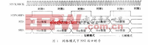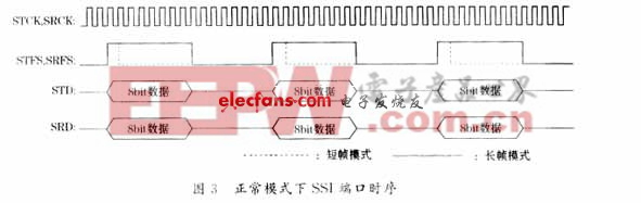 SSI端口的应用非常灵活,可通过配置相应的控制寄存器将SSI端口设置成应用中所需要的工作方式。SSI具有两种基本的操作模式:正常模式和网络模式,每种模式又都支持同步和异步协议。SSI端口在正常模式下每一帧中只传输一个数据字(即经过采样量化编码后的数字语音信号,数据字位宽可通过配置相应寄存器来改变);而在网络模式下每一帧中可以传输2到30个数据字。同步和异步协议是针对SSI发送与接收部分的相互关系来说的。在异步模式下,SSI端口的发送和接收部分完全相互独立,都拥有各自的位同步时钟和帧同步时钟;而在同步模式下,SSI端口的发送和接收部分共用同一个位同步时钟STCK和同一个帧同步时钟STFS。帧同步信号,顾名思义,即,用作数据帧的同步,该信号可配置成短帧模式(帧同步信号为一个位时钟宽度)和长帧模式(帧同步信号为一个数据字宽度)。