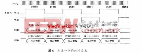 由于位时钟频率是帧频的16倍,且它们之间是完全同步的,因而帧同步信号在位时钟的移位下,经过8个时钟周期所得到的结果即相当于取反。因而,DSP中的SSI端口与CODEC间信号的时序关系与方案一中是完全相同的,参见图6。