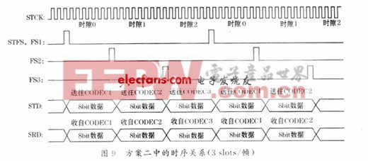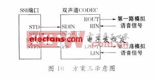 这种方案是通过选择双声道的CODEC来实现的,连接示意框图参见图10。这时,CODEC中的SSI端口就工作在网络模式,每帧为两个时隙,它在第一个时隙中传输左路采样信号,而在第二个时隙中传输右路采样信号。我们将DSP中的SSI端口作相应的配置即可实现我们所需要的功能,具体情形就不赘述了。这里需要说明的