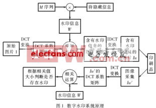 水印的提取过程与水印的添加过程大体相反。为了保证图像的大小与原图相同,将一幅含有水印的印刷品在合适的灯光照明和适当的物距下,通过高端CMOS图像传感器及其外围电路采集到存储器,将图像从RGB空间转换为CIE-XYZ空间,提取其中的亮度分量;然后对其进行16×16 DCT变换,选取前10个较大的DCT系数,用已知hi序列与之进行相关运算。由于经M序列调制的hi具有很好的自相关特性,当图像中含有水印时,相关运算的值超过一定的阈值即表示此图像含有水印,反之则表示这幅图片中不含有水印信息。通过上述方法,可以在需要受到保护的图像中添加水印信息,然后用本论文阐述的机读设备进行检测,从而将不受保护的图像检测出来。对于含有水印信息图像的复制印刷品,由于其水印能量被削弱,因此检测得出的相关值偏低,也能将其淘汰。经试验得出,正品的相关值都在40%以上,而正品的复制品都在15%以下,不含水印信息的相同印刷品的相关值都在10%以下。