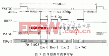 在得到图片的DCT系数矩阵以后,取出每个16×16块的前10个较大的DCT系数,形成一个一维序列,与前面提到的水印序列hi进行相关运算。相关运算值超过一个由试验得出的阈值则表明检测到水樱相关运算公式为: 2 系统硬件 数字水印检测设备的硬件框图如图2所示。CMOS图像传感器是近年来发展迅猛的一种图像传感器,一些高端CMOS芯片所获得的静态图片,其质量可与CCD媲美。本文采用Omnivision公司的高端CMOS芯片OV3610,它具有300万像素点,能够提供高品质的图像。本文采用FPGA通过SCCB接口对OV3610芯片进行控制,采集图像。SCCB接口是Omnivision公司开发的一种串行接口技术。它是一种串行接口总线,由时钟信号、输入数据、输出数据组成。主机可以通过SCCB接口访问CMOS传感器的内部寄存器,从而控制CMOS的工作模式、输出图像的格式、图像的增益、RGB各个分量的增益、曝光时间、曝光强度、图像开窗等,使得到的图像便于识别水印。图像的读取是由FPGA进行时序控制的,图像的输出接口包含了10位的图像数据线和同步信号VSYNC、HSYNC、HREF.其中VSYNC信号进行帧同步,HSYNC信号进行行同步,HREF用于标志一行未传输完毕。时序如图3所示。 本文采用容量为256K×16bit的SRAM作为DCT系数的存储体。要完全存储DCT变换的数据是不可能的。因此,FPGA计算出的DCT系数并不能完全存储,也没有必要。因为水印是添加在每个16×16块的前10个系数里,因此只需保存每个块的前10个系数,3145728像素图片产生的水印信息只有120KB.待FPGA完成图片的DCT计算后,DSP得到运算完毕信号,从SRAM中取出DCT系数,进行相关运算。如果运算结果超过事先设定的阈值,则认为该图片存在水印,反之为不含水印。检测结果通过系统控制器在点阵液晶屏显示,并且触发语音报警器,实现语音报警。此外,该系统还具有与PC机的通信能力,能够通过RS232接口从PC机下载新的水印信息,因此便于水印的更新。要检测含有不同水印信息的图片只需下载不同的水印信息即可。 经过试验得出图4、图5、图6所示的仿真结果。该系统能够稳定地检测出含有水印的图像和不含水印的图像。对于含有水印的图像复制品,可以通过设置恰当的阈值予以鉴别。一般含有水印的原始图像的相关值处于一个平均值,而图像复制品处于一个较低的平均值。该系统每次检测耗时小于2秒,能够进行水印的快速检测。