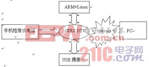 整个监控系统主要是由ARM、GPRS DTU、USB摄像头和PC组成。ARM开发板以Linux操作系统编写驱动,通过指令调度利用USB摄像头进行图像采集,将采集好的图像通过GPRS DTU进行无线传输,PC与因特网相连接,接收到GPRS DTU传输过来的图像,通过VC++编写上位机,可以看到监控点传输的图像。操作人员可以通过短信或电话对监控端进行控制,可以使监控端随时处于工作或关闭状态,这样一来不仅可以随意对监控端进行控制还可以节省流量,经济实惠,特别适用于一些对动态图像要求不高的环境,系统结构框图如图1所示。