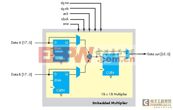 Cyclone III FPGAs中的嵌入式DSP功能块(如图4所示)为设计更复杂和效率更高的电机控制系统提供了关键要素。基于FPGA的DSP芯片使得大型家电制造商能够降低研发时间和成本,并且在未来升级时不需要重新布板。FPGA所提供的可重配置解决方案可用来实现DSP应用以及满足高DSP吞吐率的需求。由于FPGA可以实现硬件重配置,因而能实现完整的硬件定制并实现复杂的电机控制DSP功能。因此,由FPGA实现的DSP系统可以具有定制的架构、定制的总线结构、定制的存储器、定制的硬件加速器模块和各种大量的乘法-累加(MAC)块。