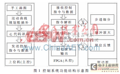 本系统的设计目标是实现两轴联动的运控系统,主要由PC机、FPGA从控板和电机驱动板三个部分构成,系统结构如图1所示。上位机(PC)的主要功能是对系统运行过程进行控制规划和粗插补(曲线加工规划)。FPGA从控板的主要功能是对加工进行精插补,在此二次插补完成后通过速度补偿模块对插补的执行速度进行补偿,进一步减小插补的偏差,产生直接用于驱动步进电机进行直线/圆弧运动的脉冲信号。驱动电路的作用是将脉冲控制信号进行功率放大,以直接驱动电机,同时为了提高控制精度,可以使用其细分电路对电机的步进进行1、2、4、8次的细分。