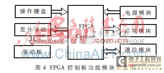 作为脉冲控制指令的直接生成者,FPGA从控板在整体的设计中具有核心地位。由于本设计的输入输出信号有两路不共地的电压输入,因此电源设计与信号隔离至关重要。简易键盘作为系统控制输入,主要进行系统运行方式的选择和控制指令输入。对于系统中简单的开关量,直接用LED显示;而对于复杂的系统状态,如执行时序状态机的监视,则需要借助LCD进行监控。FPGA从控板需要接收来自上位机的加工指令序列,串口作为最为常用的通信接口,它能够保证数据信息以足够高的速度由上位机发送到FPGA从控板上,完成控制操作[3]。