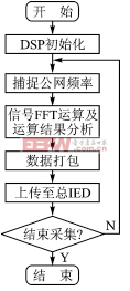 网的频率。随后的工作就是读取来自A/D转换器的数据,一组128个分别对应两个周期的电压电流和末屏电流值。每128个数据分别进行FFT运算,运算的结果将进一步分析以得出功率因素、介损角等值。IED数据采集、运算、上传过程如图3所示。 图3 IED数据采集、运算、上传过程 需要DSP计算的参数是高压A、B、C三相电压、三相电流的有效值,中压A、B、C三相电压、三相电流的有效值,各相电压电流的2~13谐波的幅值和谐波畸变率,以及高中压三相的功率因素、介损角值。DSP算法要解决的难题是计算出2~13谐波和各相的功率因数。算法的核心是FFT算法。 智能电网最少也需要采集20路信号。首先是DSP的相关功能初始化,包括串口、GPIO、EVA事件捕捉模块和定时中断。然后通过普通I/O引脚作为触发信号,依次选择多路A/D输入信号,这些信号通过信号调理电路在信号波形稳定后可以经过MAX125被采样。通过数据总线传递给DSP,DSP经过一系列运算后得到功率因素、介损基波谐波含量,并将这些数据按照一定的数据格式打包,通过串口发送到ARM微控制器。AR M再将这些数据传输给上位机监控软件。 具体代码如下: 2.2 电网参数的计算 DSP接收到A/D转换的数据之后就立刻进行计算。在本设计中,电网的谐波含量和谐波因素是计算的一个重点。在电力系统中谐波产生的根本原因是非线性负载所致。当电流流经负载时,与所加的电压不呈线性关系,形成非正弦电流,即电路中有谐波产生。谐波频率是基波频率的整倍数,根据傅里叶分析原理可知,任何重复的波形都可以分解为含有基波频率和一系列为基波倍数的谐波的正弦波分量。谐波是正弦波,每个谐波都具有不同的频率、幅度与相角。 谐波可以区分为偶次与奇次性,一般地讲,奇次谐波引起的危害比偶次谐波更多、更大。在平衡的三相系统中,由于对称关系,偶次谐波已经被消除了,只有奇次谐波存在。利用FFT算法可以将电网电压/电流分解为50 Hz基波和多次谐波的叠加。如此一来某个特定频段上的谐波就显而易见了。 除了谐波的计算需要使用到FFT算法之外,系统还有其他参量的计算。由于调用的功能模块十分复杂,只对部分参数的计算过程进行描述。多数参数都是通过对采集点的离散积分求得的。 高压A相电压有效值: 高压A相电流有效值: 单相电压/电流谐波畸变率: 中压A相电流谐波含量: 高压三相电压总谐波畸变率:计算出各相电压的各谐波含量和基波含量,用总谐波含量除以基波分量。 单相电压功率因数:由FFT算法得出基波有效值的(虚部/实部)的反正切值。 单相介损:将末屏电流和对应相电压分别作FFT运算,所得的相位作差,该相位差角度为介损角。 3 总结 该系统应用于智能变压器系统中,可多个通道同步采集,转换精度高。经实验验证,信号采集模块的实时性和精度上都取得良好的效果,且工作稳定可靠。该系统采用高速14位并行A/D转换器,简化了接口设计,提高了读取速度以及数据处理速度。通过CPLD实现各种复杂控制信号,通过改变XF引脚的电平,可以将外扩SRAM、Flash映射到数据空间或程序空间。DSP芯片通过CPLD芯片连接高精度数据采集芯片MAX125实现信号的多路高速同步实时数据采集,抗干扰能力强,并利用FFT算法准确计算出电网谐波因数、功率角、介损角。