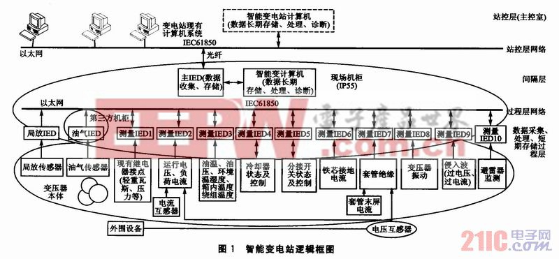 基于IEC61850的智能变电站的逻辑如图1所示。IEC61850协议主要定义了变电站的信息分层结构:过程层、站控层和间隔层。本文重点研究智能IED设备,按照IEC61850协议的描述,IED检测设备位于间隔层和过程层。其中,负责存储测量数据、进行电网数据分析和诊断的主IED位于间隔层;与现场传感器直接联系的测量IED位于过程层;处于站控层的变电站现有计算机系统将存储长期的历史数据和诊断结果。