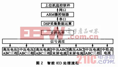智能IED处理流程如图2所示。检测的信号主要是三相电压、三相电流信号。信号前端电路将执行低通滤波功能,滤除对信号影响比较大的杂波。随后信号被高速A/D转换器采集,通过A/D转换器+CPLD电路实现,最后通过数据总线送至DSP。完成参数计算后,DSP把数据格式进行统一打包上传给主控IED,其主要功能是接收检测IED的数据,并上传给数据库。
