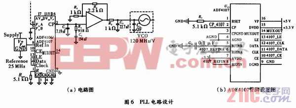 设计锁相环电路,对DDS输出信号完成32倍频,频率步进为10 Hz。后续混频电路将该路信号作为本振信号,所以其相位噪声和杂散指标对最终输出信号的相位噪声以及杂散有着直接的影响。考虑鉴相频率范围、相位噪声等指标,设计选用Analog Devices公司的PLL频率合成器ADF4107。ADF4107由低噪声数字鉴频鉴相器、精密电荷泵、可编程参考分频器、可编程A和B计数器以及双模预分频器(P/(P+1))组成。A(6位)、日(13位)计数器与双模预分频器(P/(P+1))配合,可实现N分频器(N=BP+A)。此外,14位参考分频器(R分频器)允许PFD输入端的REFIN频率为可选值。如果频率合成器与外部环路滤波器和电压控制振荡器(VCO)一起使用,则可以实现完整的锁相环。ADF4107最高鉴相频率为104MH z,相噪基为-219 dBc/Hz,采用ADIsimPLL软件可以方便的仿真并设计出外部锁相环路滤波器。