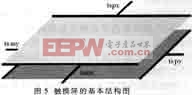 通常,供掌上设备使用的触摸屏一般都与LCD液晶屏集成安装在一起,紧贴在LCD的表面。SHARP 3.9寸TFT LCD(LQ039Q2DS54)表面装有一个电阻式触摸屏,其基本结构如图5所示,分为X和Y上下两个极板。