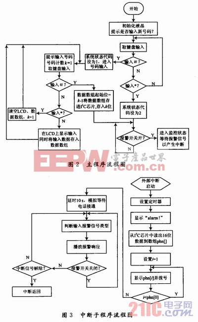 中断子程序基本流程如图3所示。首先建立一个整形数组numi[],将号码位数k保存在numi[0]中,而电话号码则保存在numi[1]~numi[k]中;然后将数组numi[]的前k+1位一次性发送至I2C芯片。读取的时候,从读取数据首地址一次性读取出16位数据(电话号码最多14位),将其保存在整形数组phn[]中,拨号的时候从phn[1]开始,一共读phn[0]次,这样不但可以准确的传输电话号码并进行拨号,同时对I2C芯片的