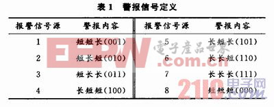 该设计共有8路外部模拟报警信号输入,其警报信号定义如表1所示。将长音视为1,短音视为0,则警报内容可译为报警信号源代码的BCD码低三位,以此作为报警类型标识。
