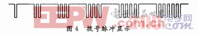系统运行后,首先初始化系统,并显示系统信息,数秒钟的延时之后LCD将显示提示“是否输入新号码?”,若按“#”则进入号码输入界面。输入完毕后按“#”结束输入,如果输入错误则按“*”重新输入,若按“*”则进入等待状态,若报警开关未打开,则进入空闲状态,此时按“#”可以修改已存储的电话号码。若报警开关已经打开,则进入监控状态,此时按“#”依然可以修改之前存储的电话号码。若此时有外部报警信号进入,则进入中断程序,开始拨号。同时,可用电压探针探测到输出的拨号脉冲序列,如图4所示。根据脉冲拨号原理,数字1~9拨号脉冲个数与拨号数字相同,0的脉冲个数是10。