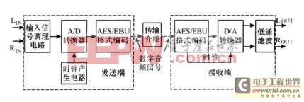 AES/EBU标准是AES和EBU一起开发的一个数字音频传输标准,它是传输和接收数字音频信号的数字设备接口协议,规定音频数据必须以2的补码进行编码。传输介质是电缆,允许高带宽容量和由A /D转换器产生的并行数据字节的串行传输。在串行传输16~20 bit的并行字节时先传输最低有效位,必须加入字节时钟标志以表明每个样值的开始,最后的数据流为双相标志码编码,另外时钟信息也内嵌进了AES/EBU信号流中。
