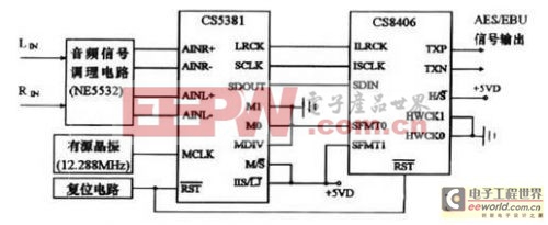 根据前节所述的系统方案,我们选用Cirrus Logic公司的CS5381和CS8406分别完成模拟信号的A /D转换和AES/EBU格式编码发送,电路原理如图2 所示。
