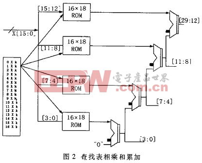 在这种结构中,时钟是f1,内部操作的时钟是4×f1,其中的4个多路复用器每次可以从16路信号中选出4位用作ROM的地址线。每次4位地址从ROM中读出数据,经过相应的移位相加即可,两位计数器用来控制这些多路复位器的输出。