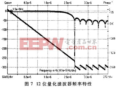 由于在数字滤波器中,各节系数字长有限,所以还要对计算出来的实系数进行量化处理,即浮点数向定点数转换。系数量化后的频域特性如图7所示,量化字长为12。