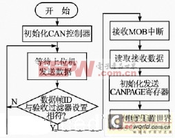 下面以如何实现AT90CAN单片机与PC机间的CAN通信为例,进一步说明AT90CAN单片机的CAN功能模块驱动的编制流程,如图2所示,并给出C语言编写的CAN通信程序。它的功能是接收PC机经由专用的PCICAN模块扩展的CAN接口发出的数据,并将收到的数据与验收过滤器寄存器中设定的ID值比较。如果ID值相符,则将数据重新编制ID后发给PC机。