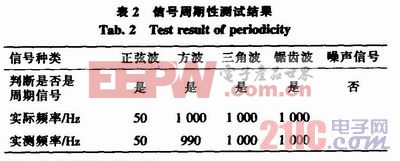 通过函数发生器输入一般的周期信号,输入50 Hz的正弦波,以及1 000 Hz的方波,三角波,锯齿的周期波和非周期噪声信号,表2为测试结果,可见对一般的信号的周期性判断很准确,频率测试误差在1%以内。