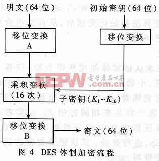 连续进行16次操作,每次更新一组密钥。移位变换B是移位变换A的逆变换。图4为DES体制加密流程,图的右侧表示DES系统的密钥生成过程。初始密钥是一串64bit的随机序列。经过反复移位变换,产生16组子密钥(K1~K16),每组子密钥用于一次乘积变换。所谓初始重排(IP)就是打乱输入分组内比特原有排列次序,重新排列,排列方式是固定的。