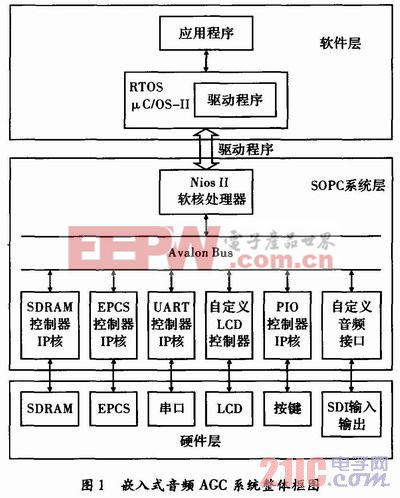 在系统结构上数字音频AGC系统的设计主要包括3个层面:最底层是硬件层面,即物理硬件电路的原理图设计,包括各功能IC的外围电路设计;中间层是SOPC系统层,其设计主要有NiosⅡ软核处理器的配置和添加,选择各种可定制的外设IP核和自定义所需模块,将定制好的各个外设模块与Avalon总线进行连接,并为分配外设地址及中断,最后经编译、综合生成可在FPGA内实现相应功能的SOPC系统模块;最上层的是软件层,主要是NiosⅡ软核处理器运行的软件程序,是用C/C++代码编写的,包括μC/OS-Ⅱ实时操作系统,设备的驱动程序和应用程序。