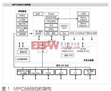 图1显示了MPC5668G的架构: 面向网关应用的双核32位MCU。它提供了2个e200系列内核,采用PowerPC架构。E200z6充当主内核,而E200z0充当协处理器。E200z6内核支持浮点单元(FPU)、信号处理设计(SPE)、内存管理单元(MMU)等,而e200z0内核要远远小于E200z6内核,因此支持的功能也较少。
