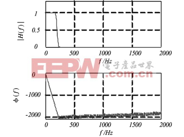 采用窗函数(Hanning窗)法设计出某200阶FIR低通滤波器,截止频率为200Hz,分析频率为2KHz,其幅频曲线及相频曲线如图3所示。