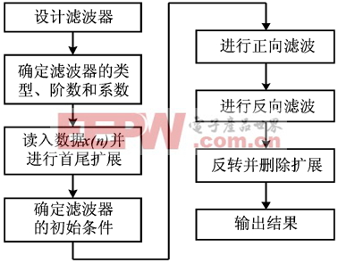 作者利用Delphi7编写了利用双线性Z变换法设计Butterworth型IIR滤波器和利用窗函数法设计FIR滤波器,以及差分数字滤波算法和零相位数字滤波算法应用程序,并作为集成测试软件平台的一个虚拟仪器。其中零相位数字滤波算法程序设计流程如图6所示。