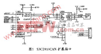 由于S3C2410和S3C44B0不带CAN接口,所以必须对其进行扩展。S3C2410的CAN 扩展接El如图1所示,S3CA4B0的CAN接口与其相似。