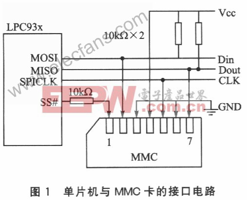 LPC93x单片机与MMC卡的接口电路如图1所示。