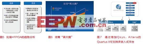 不久前,Altera在京宣布通过新系统级集成工具,针对嵌入式系统配置功能启动嵌入式计划。其FPGA设计流程将支持基于ARM、Intel、MIPS体系结构多种嵌入式处理器产品。Altera产品和企业市场副总裁Vince Hu专程来京,他从业界需求的角度,阐述了处理器+FPGA将带来的巨大能力(如图5)。