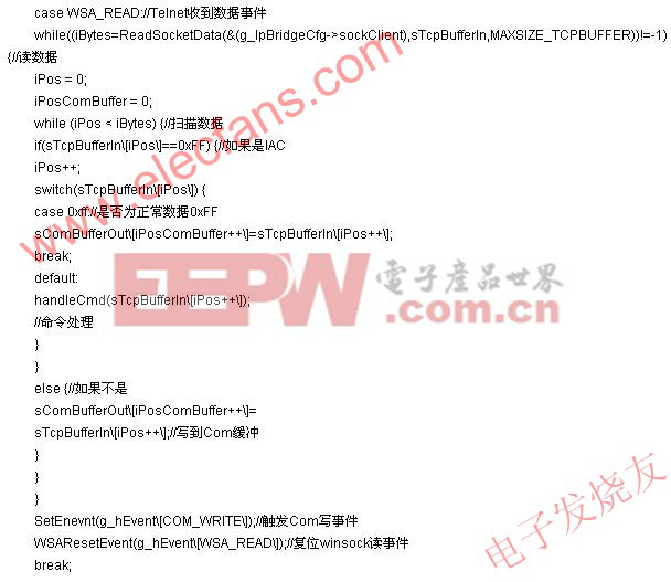 去掉,而且对于定义的如控制电源和I/O的命令必须进行相关的操作。反之,从串口接收的数据在发送到Telnet客户端之前,必须在所有的0xFF字符之前多加一个0xFF。下面是对从Telnet接收的数据进行扫描过程的代码。 这里主要使用了Winsock的API来完成Telnet部分的数据读取;串口部分是通过将串口虚拟成一个文件,通过文件读写的API来完成的。此外,为了对串口其他控制线的控制,使用了GetCommState( )和SetCommState ( )两个Windows API来完成。 在实验中,使用这样一套远程调试系统,曾与远在韩国的设计中心进行联合调试并进行嵌入式系统固件程序更新下载,虽然相对于本地下载速度慢了很多,但是仍然比其他方式(如电子邮件+手工下载)更为便捷,结果更为直观。 4 总 结 使用这样一套软硬件系统来完成嵌入式系统的远程调试,既节省了大量的人力物力,又节约了开发的时间。此外,如果它和配套的测试软件结合,可以突破一台电脑只有一两个串口,同时只能测试一个嵌入式系统的局限,使一台主机同时可以和很多个嵌入式系统相连,完成自动测试和协同测试。