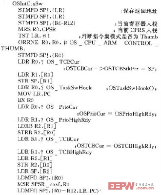 OSIntExit()通过调用OSIntSw(),在ISR中执行任务切换函数。因为OSIntCtxSw()是在ISR中被调用的,所以假定所有的处理器寄存器都被正确地保存到了被中断任务的堆栈中。OSIntSw()函数的绝大多数代码与OSCtxSw()函数是一样的,区别只是:因为ISR已经保存了CPU的寄存器,而不再需要在OSIntSw()函数中保存CPU的寄存器。在进行操作系统移植时,该段程序的代码如下: