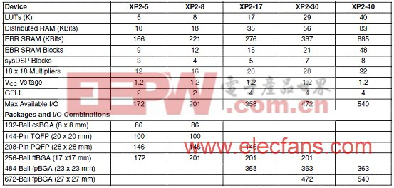 LatticeXP2器件包括基于查找表(LUT)的 FPGA以及非易失闪存单元(flexiFLASH)。LatticeXP2系列器件的LUT从5K到40K,分布是RAM从10K到83Kb,EBR SRAM从166Kb到885Kb,EBR SRAM区块从9到48个,sysDSP从3个到8个,18x18乘法器从12个到32个,可用的I/O从172个到540个,GPLL从2个到4个。工作电压1.2V,主要用在对成本敏感的市场如消费类电子,汽车电子,医疗和工业,网络和计算。
